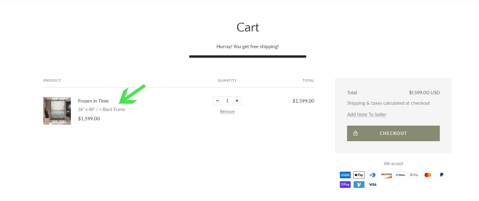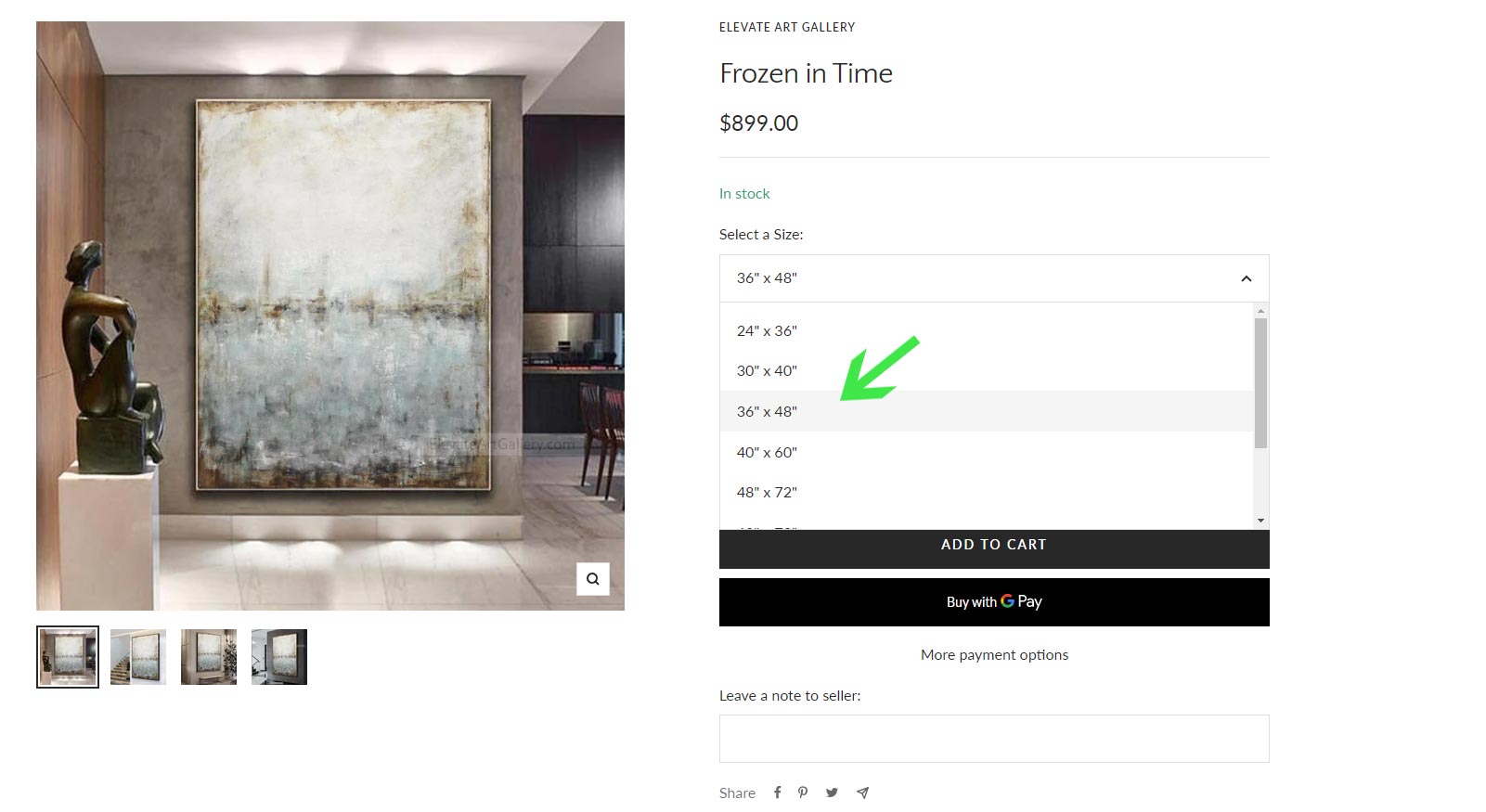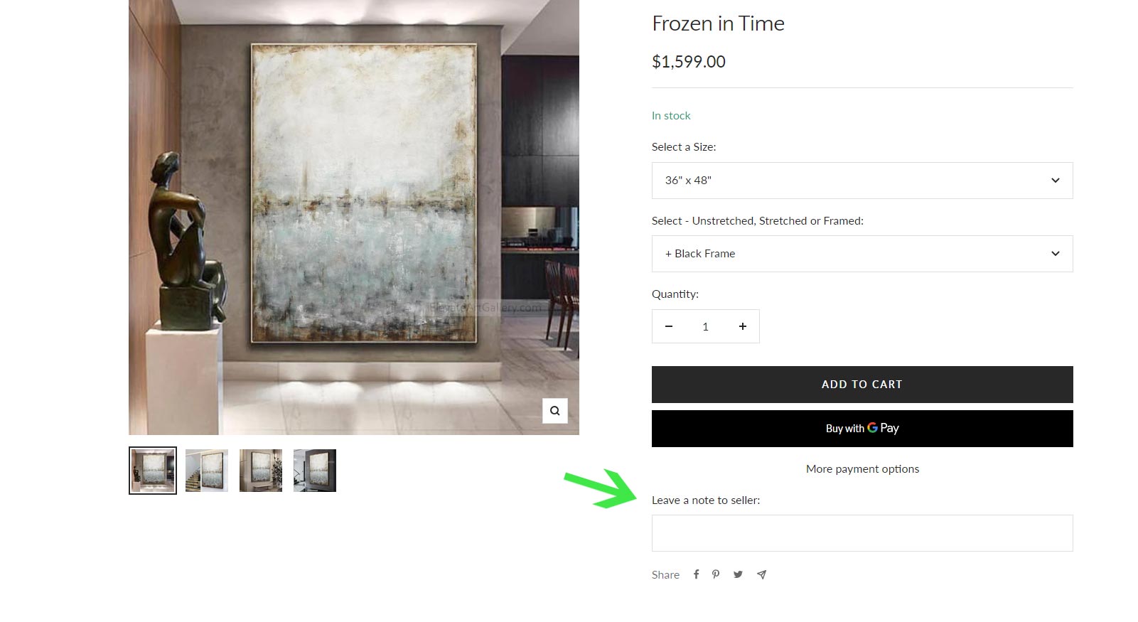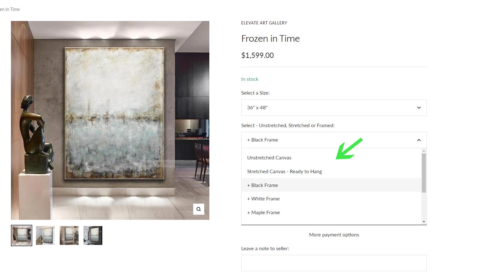 (EXAMPLE) This order includes the painting titled "Frozen In Time" in the size 36"x48" framed in the black float frame.